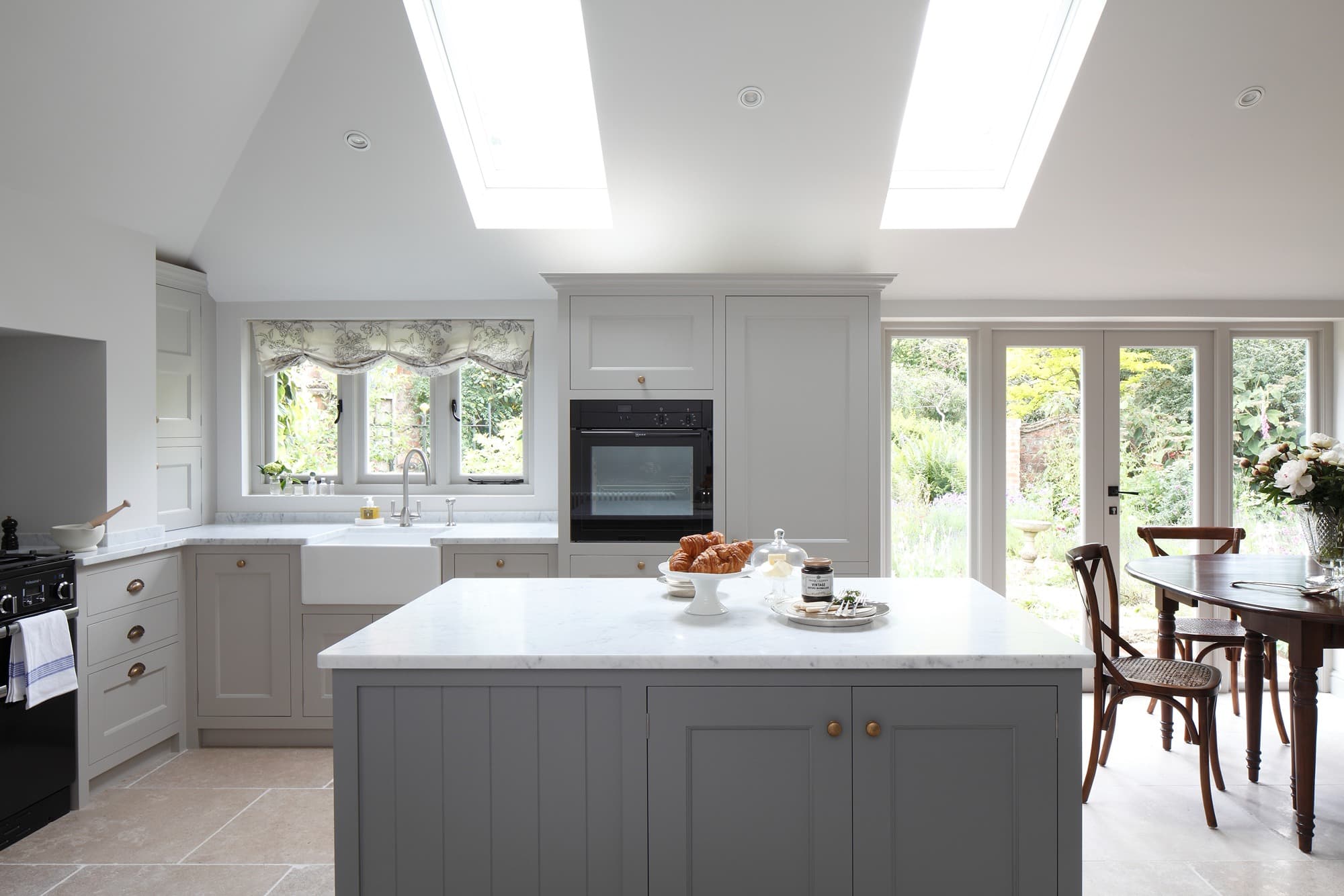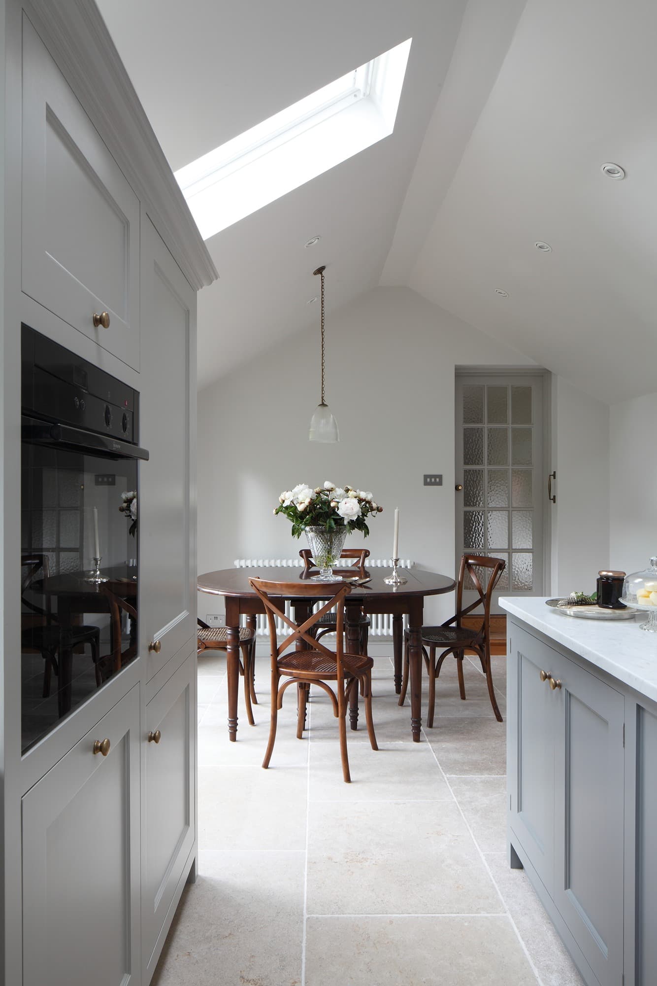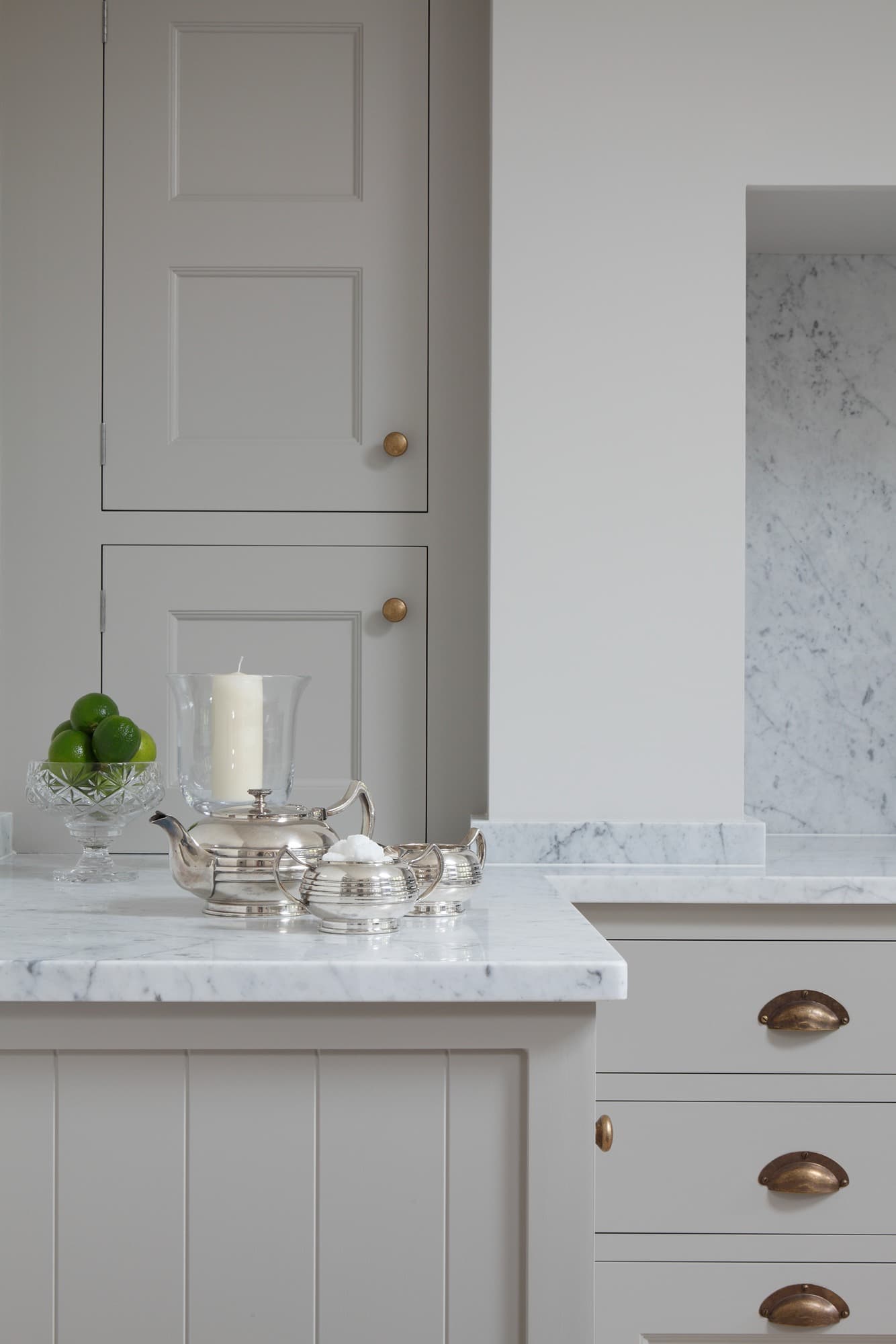 To reflect the building’s history and heritage the kitchen has a classic look with walls and cabinets are painted in Purbeck Stone and Plummett by Farrow & Ball, Carrara marble worktops together with antique brass knobs and schoolhouse pulls.