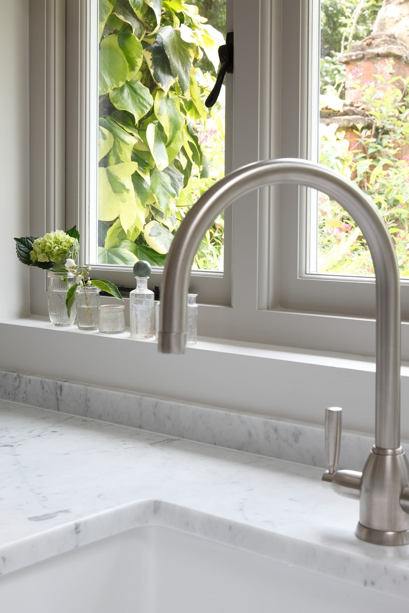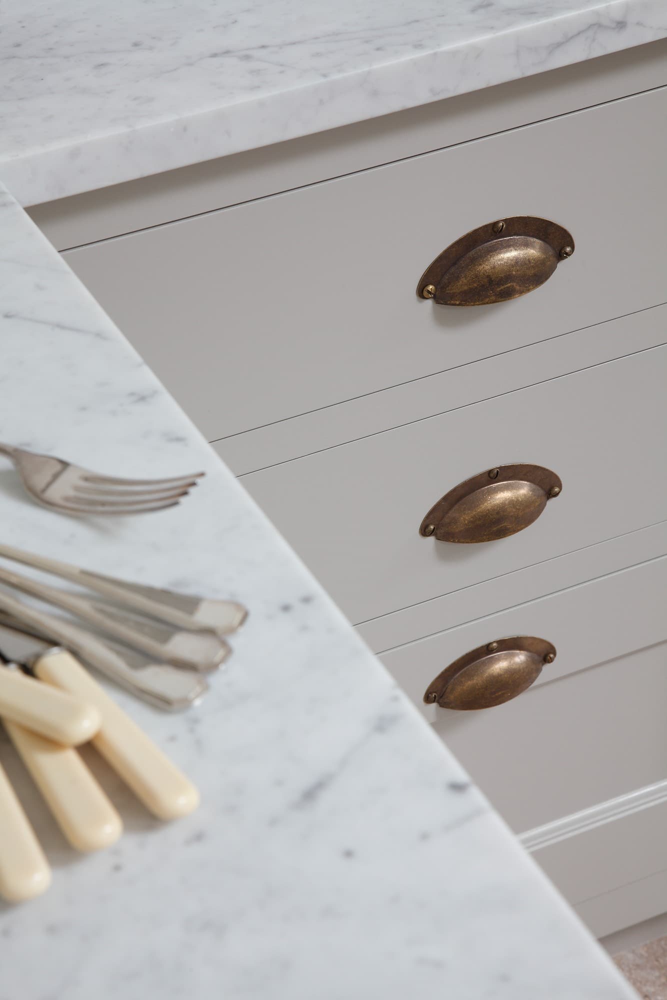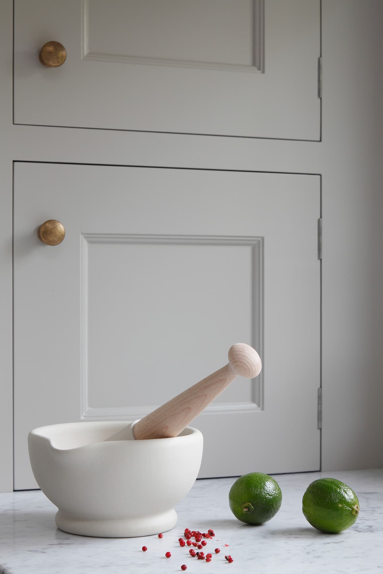To reflect the building’s history and heritage the kitchen has a classic look with walls and cabinets are painted in Purbeck Stone and Plummett by Farrow & Ball, Carrara marble worktops together with antique brass knobs and schoolhouse pulls.